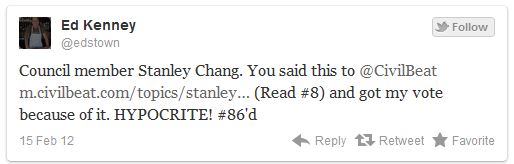 Re: the Purple Spot decision Ed Kenney tweets his disapproval of Stanley Chang's vote